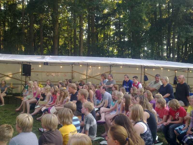 … und ein großartiges Gemeinschaftsgefühl! 74 Kinder und 32 Gruppenleiter erlebten eine tolle Woche mit Spiel, Spaß und sommerlichen Temperaturen …und wer hätte das erwartet?! Noch donnerstags erschwerten heftige Regenfälle das Aufbauen der letzten Zelte im Lager und unsere Wiese verwandelte sich in eine Matschlandschaft, Gummistiefel ein Muss! Aber nicht mehr lange! Strahlender Sonnenschein lockte die radfahrenden Kinder ins Lager und eine Woche herrlichstes Zeltlagerwetter stand uns bevor. Badehose ein Muss! Neben den täglichen Ausflügen ins Freibad hatten die Gruppenleiter auch in diesem Jahr wieder ein abwechslungsreiches Programm erstellt, welches von den Kindern mit hohem Ehrgeiz angenommen wurde. Beim Schützenfest konnten Doreen Thomas und Lars Kuper die Königswürde erringen, bei „Mein Gruppenleiter kann…“ teilten sich die 4. und die 9. Klasse Jungen den ersten Platz und beim Geschlechterkampf waren (mal wieder 😉 ) die Mädels weit vorn! Besondere Programmpunkte in diesem Jahr waren das Fußballspiel gegen die Thuiner Alte Herren-Mannschaft, die den weiten Weg nach Löningen gereist waren, allerdings ohne Pokal wieder nach Hause fuhren, und die Kanutour, die durch die von Familie Flerlage zur Verfügung gestellten Kanus für alle Zeltlagerteilnehmer ermöglicht wurde.