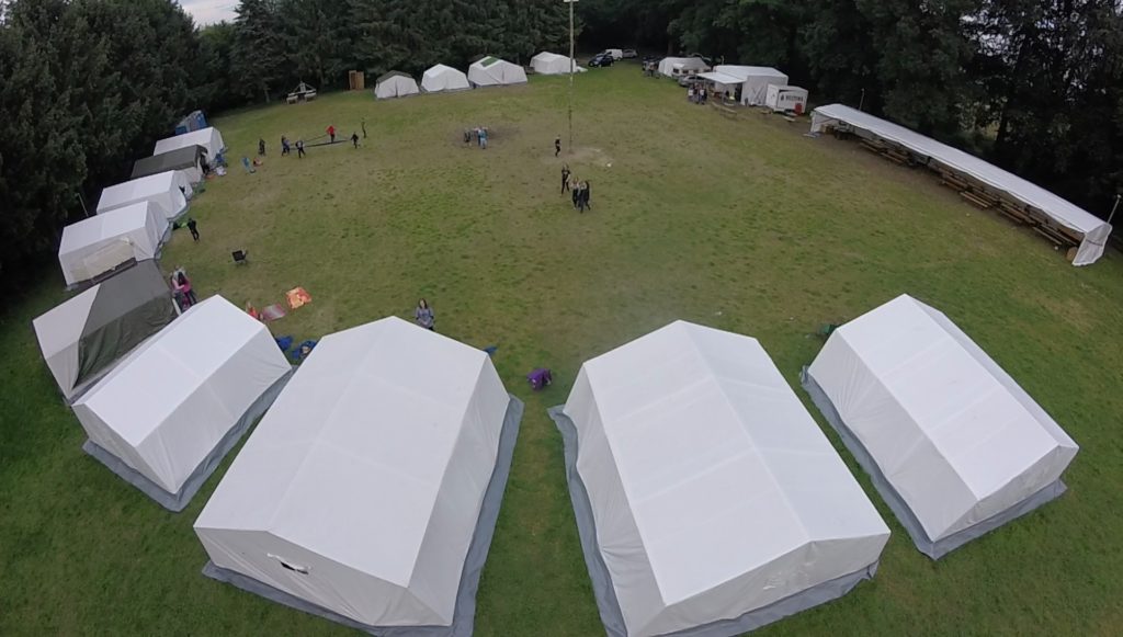 Das achtköpfige Aufbauteam war bereits seit Dienstag Mittag tätig. Mit Unterstützung der Gruppenleiter wurde das gesamte Material auf einen LKW und einen Viehwagen verladen und anschließend nach Bieste gebracht. Eine große Herausforderung bei den Aufbauarbeiten in diesem Jahr war ein sehr enger Zeitplan und der Bau einer Brücke für das Hauptstromkabel und den Trinkwasserschlauch über den Fluss „Nonnenbach“. Aber pünktlich um 17:56 Uhr war die Brücke fertig, das Kabel und der Schlauch verlegt, ein Zelt aufgebaut, eine Leinwand aufgehängt und der Beamer angeschlossen. Somit konnte das Aufbauteam das EM-Spiel der Fußball-Nationalmannschaft um 18:00 Uhr verfolgen. In den folgenden Tagen bauten die acht kräftigen Jungs die Zelte der Kinder, das Küchenzelt, die sanitären Anlagen und den Unterstand auf. Eine harte Bewährungsprobe für die Zelte und den Platz, ein ehemaliger Fussballplatz, war die Nacht von Donnerstag auf Freitag. Die ganze Nacht regnete es ohne Unterbrechung und ein Gewitter nach dem anderen zog über Bieste hinweg. Der Nachthimmel wurde durchgehend von Blitzen erhellt. Zum Glück stellte sich am nächsten Morgen heraus: „Alles Top!“