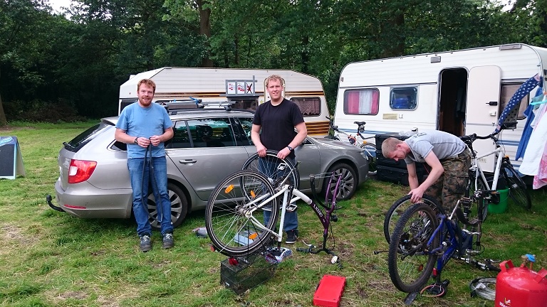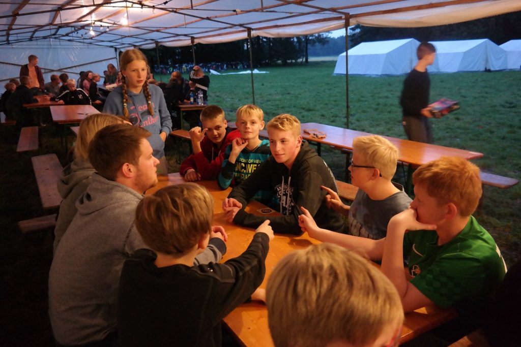 Im Zeltlager angekommen lief den meisten Kindern und Begleitpersonen das Wasser aus den Schuhen. Aber die Gruppenleiter, die am Vortag ebenfalls mit dem Rad aber bei besserem Wetter angereist waren, waren vorbereitet! Sie hatten das gesamte Gepäck der Kinder in die jeweiligen Zelte gebracht. Für die Kindern hieß es also direkt ins Zelt, die nassen Sachen aus, abtrocknen und trockene, warme Sachen an. Auch das Küchenteam war fleißig gewesen. Für alle Kinder gab es heißen Tee und warmen Kakao. Um die nassen Sachen trocknen zu können, hatte das Aufbauteam noch schnell ein freies Zelt komplett mit Wäscheleinen ausgestattet. Spätestens beim anschließenden Abendessen war dann die verregnete Anreise vergessen.