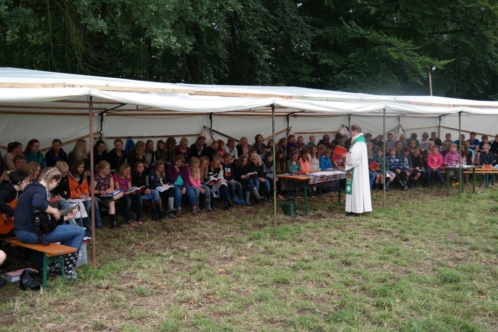 Am Montag Vormittag war dann Fitness gefragt. Das Sportturnier stand an. Etwas ruhiger ging es nachmittags beim Spiel „Blinde Kuh im Wald“ zu. Abends kam Pastor Höckelmann zu Besuch um mit uns die Lagermesse zu feiern. Ein Gottesdienst in der freien Natur hinterlässt einen besonderen bleibenden Eindruck. Nach dem anschließenden Abendessen konnte dann endlich die von vielen vermisste Lagerrunde nachgeholt werden.