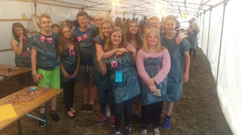 Freitag, der letzte ganze Tag im Zeltlager. Morgens sah das Programm das „Gruppenleiterverarschungsspiel“ vor. Dabei haben die Kinder die Gelegenheit, sich selbst Spiele auszudenken und die Gruppenleiter spielen zu lassen. Nachmittags wurde dann in Workshops gebastelt. Unter anderem wurden dabei schicke Klamotten geschneidert, um beim anschließenden Casino-Abend gut auszusehen. Zwischendurch wurden bereits die Fahrräder verladen und nach Thuine abtransportiert. Mit dem Spiel Mädchen gegen Jungen ging eine ereignisreiche Zeltlagerwoche zuende.