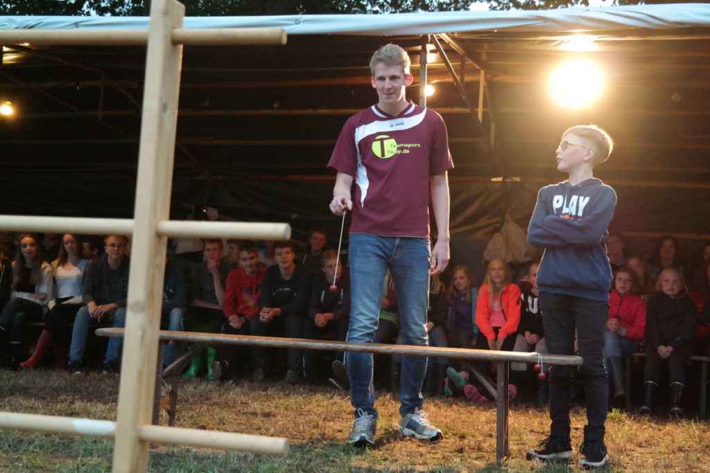 Nach dem Abendbrot ging es dann bei der interaktiven Show „Schlag den Gruppenleiter“ ordentlich zur Sache. In unterschiedlichsten Disziplinen, wie „Blindes Fingernägel lackieren“, „Marshmallows in den Mund stopfen“ und Leitergolf traten die Gruppenleiter gegen die Gruppenkinder an und mussten sich ihren Schützlingen letztlich geschlagen geben.