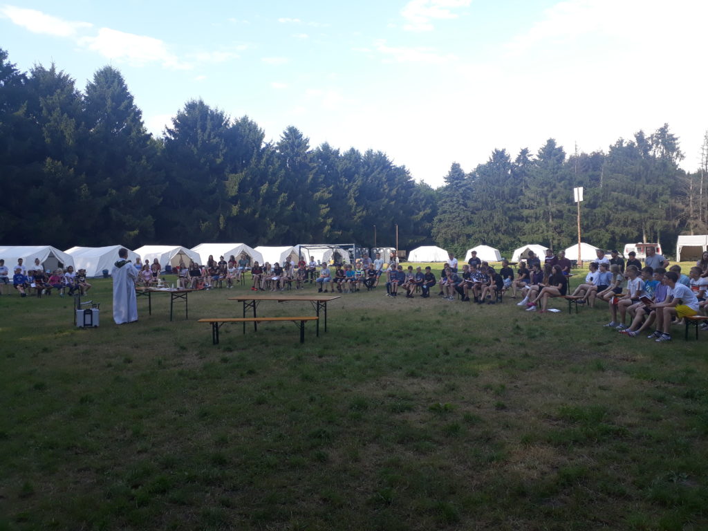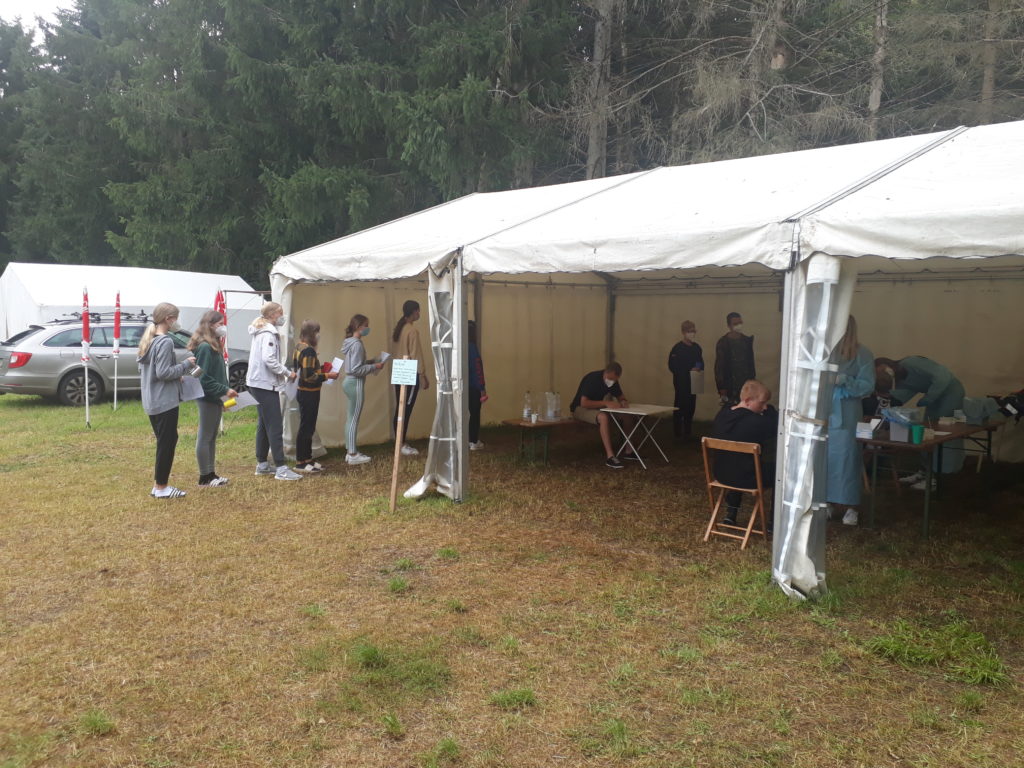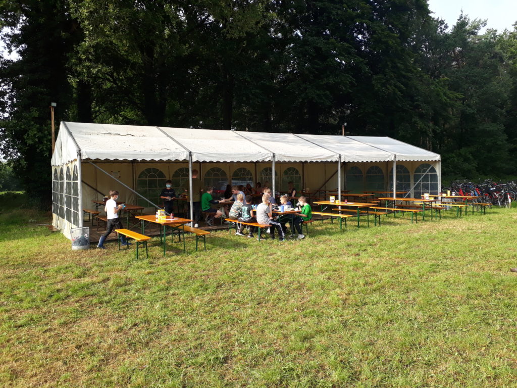 Am Nachmittag trafen die Kinder im Lager ein, das bereits seit Dienstag vom Aufbauteam hergerichtet worden war. Die 28 Gruppenleiter, die schon am Freitag, ebenfalls nach negativem Corona-Test angereist waren, warteten bereits mit dem Gepäck der Kinder in den Zelten und halfen beim Auspacken und Einrichten. Das sechs-köpfige Küchenteam heizte inzwischen den Grill ein, um Bratwürste für die von der Radtour sehr hungrigen Kinder vorzubereiten. Nach einer kurzen Ansprache und dem Erläutern der Corona-Regeln konnte das Abendessen Gruppenweise starten. Am Abend fand eine kleine Corona-Lagerrunde mit den Klassen 4. bis 7. statt. Trotz einzuhaltendem Mindestabstand hatten alle eine Menge Spaß. Dass es am frühen Abend noch einen kurzen, aber mit 40l/qm recht ergiebigen Wolkenbruch gegeben hatte, war dabei schon wieder vergessen. Die Zelte waren dicht und das Gepäck sicher und trocken darin verstaut.